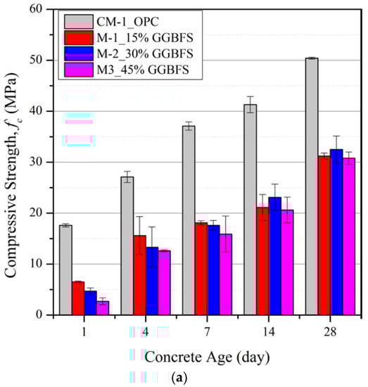 One of the common by-products that can be used as cement substitution is ground granulated blast furnace slag (GGBFS). GGBFS is a by-product of the smelting process used to convert iron ore to pig iron. It is highly cementitious with the potential to improve the strength and durability of the concrete [1,2,3,4]. However, the heterogeneity and properties of concrete are strongly governed by the mixture composition and the hydration process. This reaction between water and the materials used in the design mix significantly influences compressive strength development [1,4].