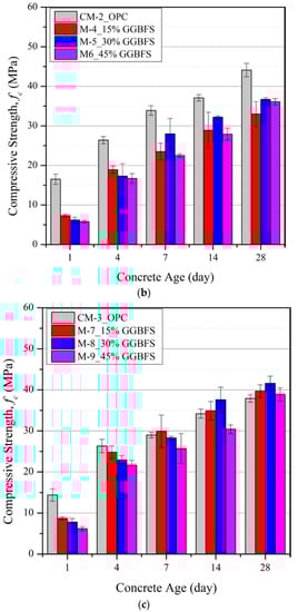 The early age compressive strengths of all the slag blended mortar mixtures are significantly lower than the OPC mixes (CM-1 to CM-3). Despite this short-term negative effect, it is evident that the relative difference in strength between OPC mixes and those with GGBFS replacement reduces as the curing age increases and, for wc = 0.6, values for mixes with GGBFS replacement of between 15% and 45% exceed those of the OPC mix at later ages. The increase in compressive strengths arises due to the excess Calcium Silicate Hydrate (C-S-H) generated in the secondary hydration process between the SiO2 in the slag powder and alkaline calcium hydroxide (Ca(OH)2) generated in the primary hydration reaction [28]. The GGBFS reduces the enrichment of Ca(OH)2 crystals at the fine aggregate-cement interface and hence increases the bulk density by filling the voids and air gaps within the mixture and also reducing the overall size of the remaining Ca(OH)2 crystals [29]. This process only led to greater strengths compared with the OPC mix at wc = 0.6, suggesting that there is a limited supply of water in the mixture available for hydration reactions or the hydration by-product, Ca(OH)2, required for pozzolanic reactions when wc < 0.6 [30,31].