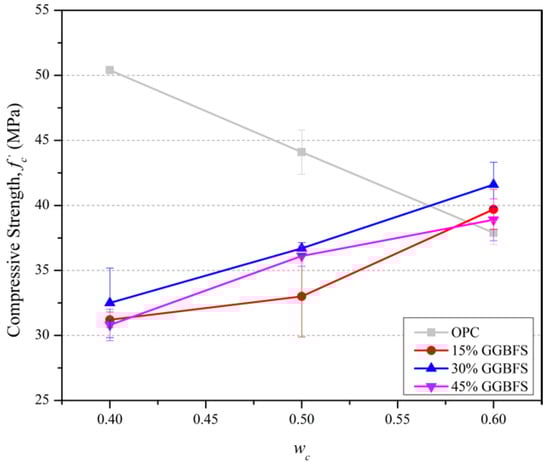 The water in the concrete paste exists as non-evaporable water (chemically combined water), such as compound water and evaporable water in gel and capillary water. As the cement paste starts to set, the water evaporates leaving behind air voids that reduce the strength, density, and durability of cement mixtures. This process leads to the trend seen in Figure 2 of reducing with wc in the OPC control mixes. Incorporating fine GGBFS into OPC mixes assists in filling voids left by evaporation [1,2,3,4,33,34]. However, a large amount of GGBFS in the mixture to fill voids does not necessarily lead to greater compressive strength because of an insufficient supply of Ca(OH)2 generated by primary hydration of a reduced quantity of OPC. Consequently, there are excessive amounts of non-hydrated GGBFS fine powder particles. This present study found that the increase in wc generally leads to greater values for slag blended mortar mixtures (for the replacement percentages of 15% to 45%).