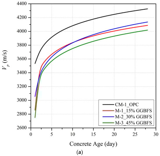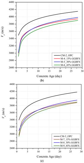 Figure 3 illustrates the influence on Vp of different levels of partial replacement of cement with GGBFS (15%, 30%, and 45%) at curing ages of 1, 4, 7, 14 and 28 days for three different wc ratios (0.4, 0.5 and 0.6). It is seen that, as for the trends with , the mean early age Vp of slag blended mortar mixtures at a constant wc is significantly less than the OPC mix. This trend reflects the slower initial hydration process as the hydration of GGBFS only begins once the alkaline level in the mixture reaches a threshold value [30,31]. From a curing period of about one week onwards, the slag blended mortar mixtures with 30% GGBFS replacement show a greater rate of Vp development with time compared to the mixes with 15% and 45% GGBFS replacements. This trend is consistent with the optimal GGBFS replacement proportion of 30% for .