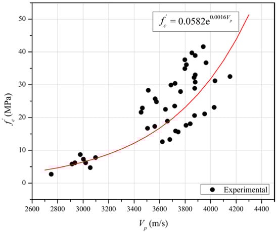 Compression wave velocity (Vp) is frequently measured in ultrasonic pulse velocity (UPV) testing of concrete to evaluate and monitor the mechanical properties of concrete. Many empirical equations relating Vp with of a range of different concrete types have been established; a selection of reported relationships is summarised in Table 1. Najim et al. [8] suggested a linear relationship between Vp and while others involve higher order polynomials [9], logarithmic [10] or multivariable regression equations [11,12,13,14,15]. However, an exponential format is the most popular form, as presented in [3,11,16,17,18,19].