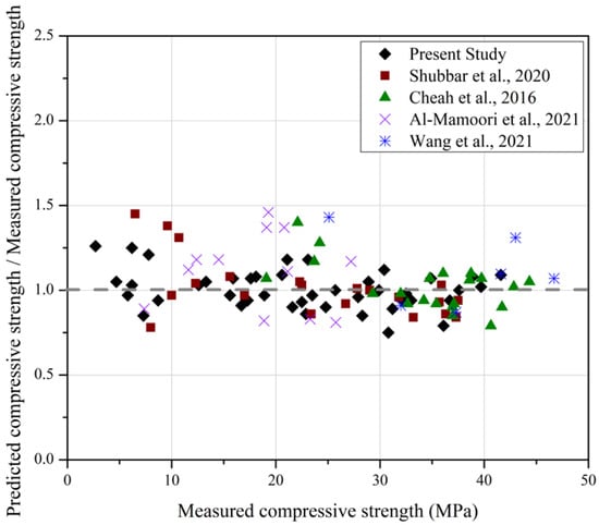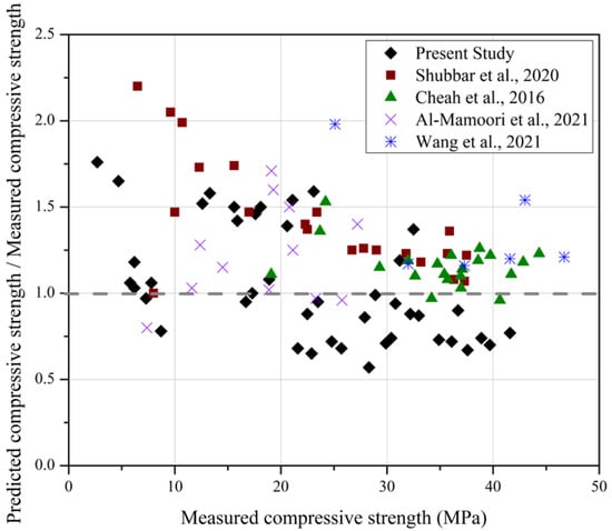 Calculated compressive strength values-to-measured compressive strength values ratio using Equation (2) [38,39,40,41].
