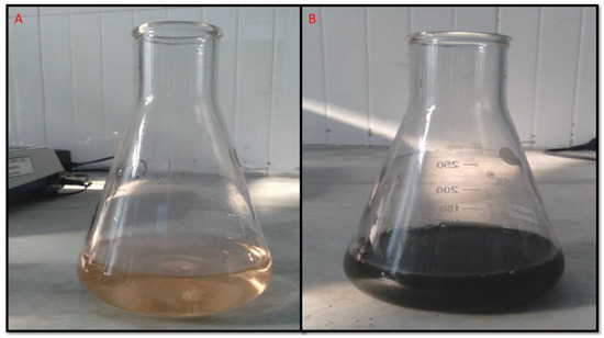 Representation of (A). silver nitrate mixed with plant extract soon after mixing; (B). silver nitrate with plant extract after 24 h.