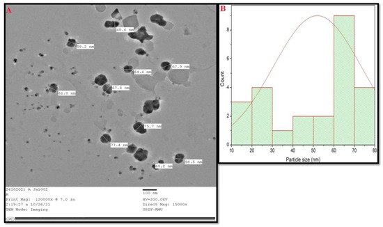(A) Representation of transmission electron microscopy (TEM) of CS-AgNPs. (B) Particle size distribution of nanoparticles.