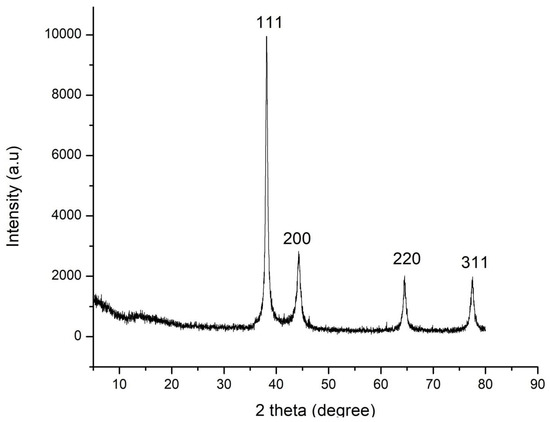 The XRD analysis confirmed the crystalline nature of the nanoparticles. The diffraction peaks at 38.2°, 44.36, 64.48, and 77.4 related to 111, 200, 220, and 311 facets of the face centered cubic (FCC) crystal lattice, corresponded to silver (JCPDS card no 04-0783) (Figure 5).