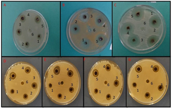 Well diffusion assay representative of (A) K. pneumonia, (B) S. aureus, (C) E. coli, (D) C. albicans, (E) C. tropicalis, (F) C. dubliniensis, (G) C. parapsilosis. 1 = 31.25 µg/mL, 2 = 62.5 µg/mL, 3 = 125 µg/mL, 4 = 250 µg/mL, 5 = 500 µg/mL, 6 = control (distilled water).