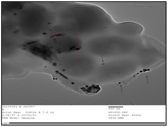 Candida albicans form a biofilm, which makes it adhere more strongly and compactly to the surface, developing resistance to antifungals [45]. The extracellular polymeric substance secreted by C. albicans prevents the diffusion of antifungal drugs into the cell [34]. The biofilm is itself a problem of great concern, which should be eradicated. Silver nanoparticles decreases the biofilm formation, which can be observed through CLSM images. The CLSM image shows that at 500 µg/mL of CS-AgNPs, a minimum number of cells remain attached on the surface, showing the reduction in biofilm formation. We are also of the opinion that CS-AgNPs arrest the release of exopolysaccharide, which does not allow Candidal cells to adhere onto the surface. Our results are in agreement with the previous studies of Ahamad et al. [46], which revealed the inhibition of Candida albicans biofilm using biogenic silver nanoparticles. Further, Figure 7 represents the interaction of nanoparticles with the fungal cells, and it is very clear that all the nanoparticles are not internalized in the Candida albicans; rather, few nanoparticles are found at the surface of the Candidal cells (black arrow), whereas some of the nanoparticles have internalized the Candidal cells (red arrow). These surface-attached and internalized nanoparticles have probably disturbed the usual mechanism of the Candidal cells; therefore, cell death has occurred. Our results are in agreement with the previous studies of Vazquez-Muñoz et al. [47], which presented the interaction of silver nanoparticles with Candidal cells and the accumulation of silver nanoparticles. Vazquez-Munoz et al. [47] concluded that silver nanoparticles accumulate outside the cell and released the silver ions, which induces cell death through the reduction process.