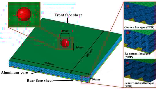 The honeycomb sandwich structures were modeled, including a front face sheet, rear face sheet, and honeycomb cores, as shown in Figure 2. The dimensions were 400 mm × 400 mm × 30 mm, and the front and rear face sheets were 1 mm thick. The 40 mm diameter projectile impacted the center of the honeycomb sandwich face sheet at initial speeds of 25 m/s, 50 m/s, and 100 m/s. For honeycomb sandwich structures to effectively dissipate the energy of a projectile, the projectile’s diameter should be larger than the size of the cells [36]. The projectile will penetrate through the core for projectile diameters less than the cell size. At the same time, considering the requirements of the experimental equipment, a 40 mm spherical projectile was selected in this paper. When the projectile hit the panel, its affected area of the honeycomb panel was proportional to the projectile’s diameter. When the panel size was significantly larger than the projectile size, the panel size did not affect the simulation results. When the projectile diameter was 60 mm and the panel size was 500 × 500 mm, a good simulation effect was achieved [35], and the ratio of the projectile diameter to the panel size was 3/25. Therefore, this paper selected a square panel of 400 × 400 mm. At this time, the percentage of the projectile diameter to the panel size was 1/10, a relatively large number.