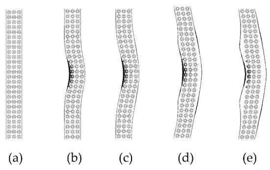 Deformation of the dual-wall honeycomb structure: (a) t/l = 0.04, θ = 30°; (b) t/l = 0.05, θ = 30°; (c) t/l = 0.07, θ = 15°.