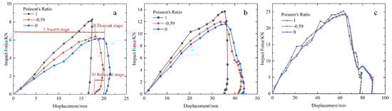 Face sheet impact forces vs. displacement of honeycomb sandwich structures with different Poisson’s ratios: (a) 25 m/s; (b) 50 m/s; (c) 100 m/s.