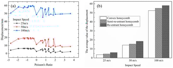 The rear face sheet displacement of the honeycomb sandwich structure with different Poisson’s ratios: (a) displacement; (b) the average value of displacement.