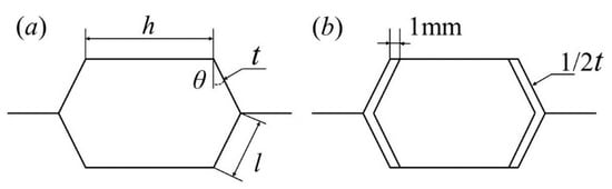 The results of Section 3.2 show that the magnitude order of the rear face sheet displacement is negative Poisson’s ratio > zero Poisson’s ratio > positive Poisson’s ratio, so the positive Poisson’s ratio honeycomb structure has the best protection ability. The displacement of the rear face sheet is significantly affected by the structural stiffness. As the stiffness becomes smaller, the deformation ability of the honeycomb core becomes stronger and the extrusion to the rear face sheet becomes weaker. To further reduce the displacement of the rear face sheet, a dual-wall hexagonal honeycomb structure with double walls with a half thickness of the single wall is proposed in order to reduce the stiffness and enhance the honeycomb core’s deformability, as shown in Figure 11.