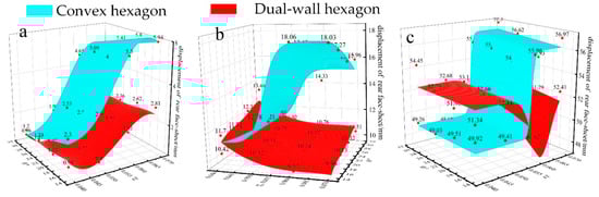 The impact resistance of the dual-wall hexagonal honeycomb sandwich structure that withstands local load by a spherical projectile impact is studied in this section. The rear face sheet displacement of the different honeycomb sandwich structures is given in Figure 12. Similar to the convex honeycomb structure, the deformation ability of the dual-wall hexagon honeycomb core decreases with the increased stiffness, which weakens the pressing effect of the honeycomb core on the rear face sheet and reduces the displacement of the rear face sheet.