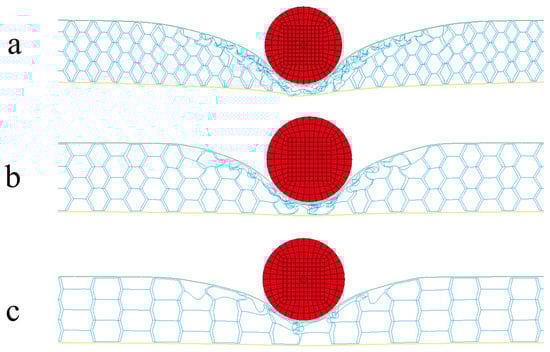 The front face sheet impact force of the honeycomb sandwich structure is convex > re-entrant > semi-re-entrant under a 25 m/s and 50 m/s impact load. When impacted at a low speed, the honeycomb core in the impact compression zone is not sufficiently densified, and the vertical (impact direction) walls mainly absorb the impact energy [7,16]. Under the condition of the same relative density, the convex honeycomb has the largest number of honeycomb walls in the vertical direction, which is easier to absorb the impact energy of the projectile and minimize the displacement of the rear face sheet. However, the shrinkage elasticity of the convex honeycomb structure was poor with the shortest softening stage and rebound stage. Semi-re-entrant honeycombs had the slightest impact but the longest platform stage, which means that they had a good cushioning performance. Under 100 m/s impact speed, all honeycomb structures produced more plastic deformation. The rebound stages of honeycomb sandwich structures became shorter, and the maximum face sheet impact force came closer. This indicates that the Poisson’s ratio had little influence on the impact resistance of honeycomb structures under a high-speed impact load. Furthermore, the impact force produces a sudden increase before the honeycomb structure rebounds, as shown in Figure 4c. This is because the honeycomb core layer was entirely compressed and densified under a relatively high-speed impact, as shown in Figure 5, resulting in a stronger impact force.