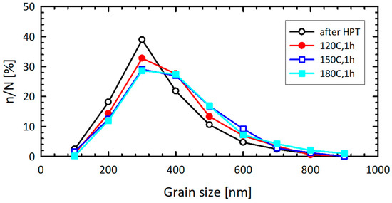 Grain size distributions of the UFG 6060 alloy after annealing at 120 °C, 150 °C and 180 °C for an hour.