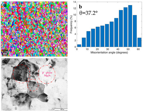 The microstructure of the UFG 6060 alloy produced by HPT (a) orientation map (transverse direction); (b) grain boundary misorientation distribution; (c) bright field TEM image revealing nanoscale precipitates and dislocations.