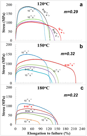 For all cases, the curves are characterized by pronounced strain hardening and a smooth decrease in the flow stress after achieving peak values. As it is assumed, the observed strain hardening is related to multiple intragranular slip, with no steady-state flow stage as observed in [36,37]. As a result of the tests, the maximum elongations reached values of 150–220% at strain rates of 5 × 10−3 s−1–10−4 s−1, and the m parameter was within 0.29–0.32. Deformation curves at 180 °C did not demonstrate considerable scattering in elongation to failure with variation in the strain rate.