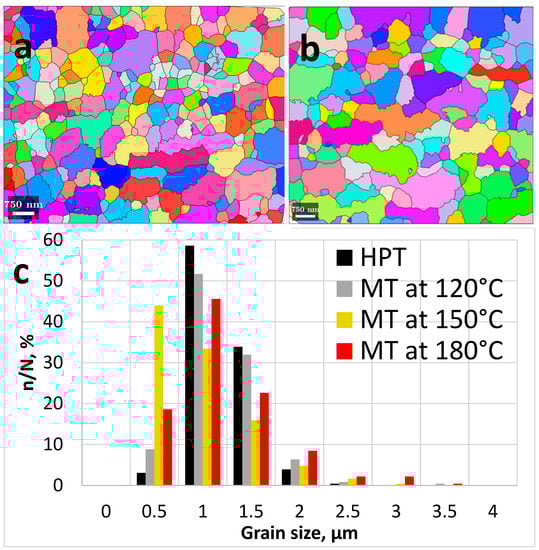 Orientation maps for the gauge areas of the fractured UFG tensile samples after deformation at (a) 150 °C and (b) 180 °C. (c) Grain size distributions for the 6060 alloy after HPT and after HPT and mechanically testing (MT) at 120 °C, 150°C and 180 °C.