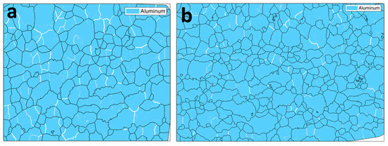 Although the microstructures look equiaxial, the quantitative EBSD analysis revealed the presence of elongated grains subdivided by LAGBs. Typical examples are shown in Figure 6 where LAGBs with misorientations less than 15° are colored in white. Figure 6 indicates that low angle subgrain boundaries split larger elongated grains. Figure 6a demonstrates visibly more pronounced formation of low-angle substructures in the specimen tested at 150 °C than at 180 °C (Figure 6b) and this is quantitatively confirmed by Figure 5c as compared to the other distributions in Figure 5. These observations suggest that the appearing equiaxial microstructure may have evolved by splitting of elongated grains, which assumes that extensive intragranular slip has occurred. This is consistent with the data published recently in [37,38,39,40]. It also well agrees with the recent findings reported in [41] which revealed that the formation of pronounced substructure within elongated grains can be a dominant mechanism of superplastic flow. Intensive formation of LAGBs as indicated by Figure 6 as well as by Figure 5c as compared to Figure 5a,b,d is thus consistent with the pronounced manifestation of SP by UFG 6060 Al alloy during tensile testing at 150 °C.