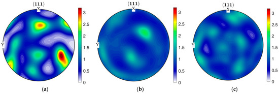 (111) pole figures calculated from by EBSD orientation data represent local texture formed in the UFG 6060 alloy after HPT and subsequent SP deformation at 150°C and 180 °C (Figure 8). For illustrative purposes, pole figures for HPT state were rotated to be aligned with the shear direction. The pole figure for the UFG alloy produced by HPT (Figure 8a) demonstrates features of deformation texture with moderate intensity of maximal pole density (the texture index denoting the deviation from random texture consisted 2.47). SP deformation at both temperatures led to the notable texture scattering visible in pole figures (Figure 8b,c), the texture index decreased to 1.22 and 1.31, respectively. Thus, SP deformation results in reorientation of grains toward random texture. This process can be induced by intensified non-crystallographic deformation modes, such as grain boundary sliding or rotation.