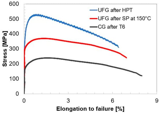 The room temperature tensile curves for the T6-treated coarse-grained and for the UFG 6060 alloy in the states after HPT and after SP at 150 °C.