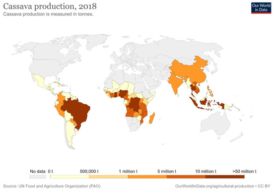 Cassava is a tuberous, woody, and perennial plant; Manihot esculenta is in the family of the Euphorbiaceae (spurge family), and cassava plant and its roots are also known as yuca, manioc, and mandioca [84,85]. The term cassava originated from the word Cazabi or Casavi, which means bread in the Arawak language (the tongues of the first Indigenous communities living in the Great Antilles) [86]. This plant is available throughout the year because of its easy harvest process and being a periodical plant. These advantages make cassava a very reliable food crop. Cassava crop is rich in riboflavin, thiamine, and carbohydrates; however, it contains no protein [87]. The regions where cassava plants are grown in the world are Africa with 72%, Asia with 18%, and South America and North America with 10% [88]. Cassava yields are most important due to their many uses in industries such as bioethanol, starch, alcohol, and biofuels, as well as being used in the animal feed industry [89,90,91]. The Portuguese began cultivating cassava along the coast of West Africa, then introduced cassava to central Africa, eastern Africa, Ceylon, Madagascar, Malaya, India, and Indonesia. The cassava was introduced to Asia by the Spanish after their occupation of the Philippines was completed, and then spread throughout Asia by the nineteenth century [92,93,94]. Nigeria, Thailand, and Indonesia are now the leading producers of cassava in the world, with the production of 54.83, 30.02, and 23.44 million metric tons (MMT), respectively, in 2017 [95]. Cassava yields from other countries are as shown in Figure 2.