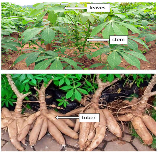 Cassava (Manihot esculenta) can be found abundantly in various nations across Asia, Africa, and Latin America. The United Nations Food and Agriculture Organization (FAO) reported that cassava is placed fourth among developing countries’ food crops, after maize, rice, and wheat. Cassava roots have high starch content, and cassava is a very productive crop from the aspect of food calories generated per unit land area per day of 250,000 cal/hectare/day, as compared to maize, wheat, and rice, which are 200,000, 110,000, and 156,000, respectively. It is likewise utilized as a feedstock for various industrial applications [97]. The cassava plant is divided into three parts, such as leaves, stems and tubers, as appears in Figure 3.
