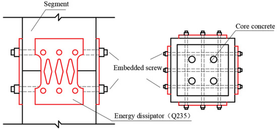 To solve these problems, this paper proposes a new type of external energy dissipator with a simple structure. This energy dissipator has good shear resistance and energy consumption capacity, is stable and reliable, and is easy to repair and replace after an earthquake. The specific design scheme is shown in Figure 1. CFST pier joints are equipped with energy dissipation devices, which have the following characteristics: During an earthquake, the opening deformation of pier joints can be limited, and plastic deformation can be generated through the device to dissipate energy. The connecting device can provide reliable lateral bearing capacity for the pier and increase the shear stiffness of the pier. Unbonded prestressing tendons provide stable self-resetting ability and reduce the residual displacement of piers. The energy dissipation device gradually narrows the section from the ends to the middle, avoiding the stress concentration at the connection between the device and pier so that the damage is concentrated in the middle part of the energy dissipation device, which is convenient to repair and replace after an earthquake.