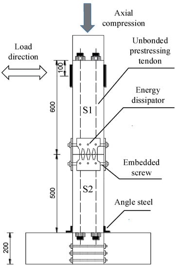 In order to verify the feasibility and effectiveness of using finite element analysis, a cyclic loading test of CFST piers with external energy dissipation devices was carried out [19]. The test piece is composed of segmental steel tubes, core concrete, unbonded prestressing tendons, energy dissipation devices, etc. (Figure 1). The pier body of the segmental assembled CFST pier is divided into two segments: S1 and S2. The size of the steel pipe section is = 200 mm 200 mm 500 mm, with a thickness of 20 mm. Q345 steel is used for steel pipes in sections, and the grade of concrete is C40. Energy dissipation elements are set at the joints of the S1 and S2 segments, which are 60 mm away from the upper and lower ends of the joint. They are connected with S1 and S2 segments through embedded screws, which can not only be used as energy dissipation components but also improve the shear capacity of CFST piers. The energy dissipation element is made of Q235 steel with a thickness of 10 mm, and a diamond hole is opened in the middle, which gradually narrows from both ends to the middle, avoiding the stress concentration damage at the screw hole and ensuring that the weakest position is in the middle of the energy dissipation element. The pier cap and cushion cap pass through 7 ϕ 15.2, the unbonded prestressed steel strand is connected, and the applied prestress is 80 kN. The test piece is shown in Figure 2.