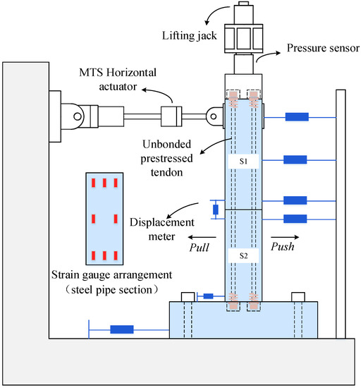 In bridge engineering, the prefabrication and assembly technology of bridge substructures has the characteristics of fast construction and high quality and is also regard as an ecofriendly technology. For urban bridges, the interference with the surrounding environment and traffic during their construction can be reduced. Due to the factory prefabrication, the segmental assembled pier can effectively control the construction quality and quickly install on-site to improve the construction efficiency [1,2]. According to the difference in seismic performance, precast assembled piers can be simply divided into “equivalent cast-in-place” and “non equivalent cast-in-place” [3]. The “non equivalent cast-in-place” precast pier is mainly connected by prestressing tendons. In earthquake events, the precast assembled pier can swing and rotate at the joint, and the provision of restoring force can restore the pier to its original position, effectively reducing the residual displacement of the pier, which ensures the whole structure has a good self-resetting ability [4]. Therefore, a “non equivalent cast-in-place” pier is also called a self-resetting pier and has become a feasible scheme for rapid and green construction that avoids the unacceptable residual deformation of a traditional reinforced concrete pier after an earthquake [5].
