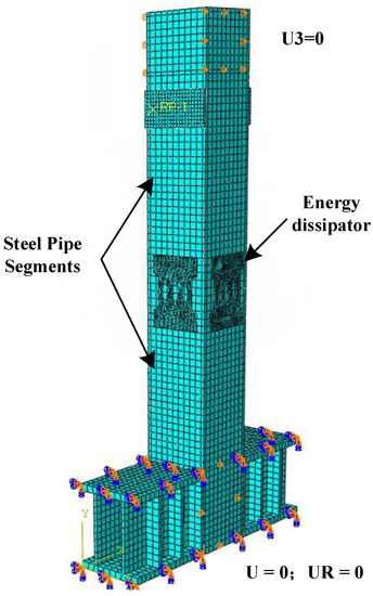 In this paper, dry joints are used between pier segments, which open and close repeatedly with cyclic loads in the process of stress, and the relative slip between joints also needs to be considered. Therefore, based on the surface contact algorithm in ABAQUS, surface to surface contact is used for the contact at the joint between segments. The normal behavior adopts the definition of “hard contact” that transfers pressure only when the gap between the contact surfaces is 0, that is, the normal pressure is transferred when the surfaces contact, and the node constraint fails when they are separated. Normal behavior is used to simulate the opening and closing of joints. “Penalty friction” is for the tangential behavior, which defines the interface friction characteristics with the friction coefficient. The friction coefficient is 0.4 [26]. Tangential behavior is used to simulate the relative slip between segments. Tie contact binding is for the contact between steel pipe and concrete, between the energy dissipator and steel pipe, and between the ground beam and the steel pipe section [27].