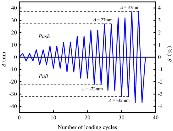 The specimen was loaded with low-cycle cyclic loading. The loading position was 100 mm away from the top of the S1 segment, and the bottom of the pier column was fully restrained to form a cantilever structure. The loading mode was the displacement controlling method. The displacement amplitude of each stage was cycled forward and backward twice, and the displacement offset rates of the loading point were 0.3%, 0.6%, 0.9%, 1.2%, 1.7%, 2.2%, 2.7%, 3.2%, and 3.7%, and the loading displacement increased from 3 mm to 37 mm. The loading scheme is shown in Figure 7.