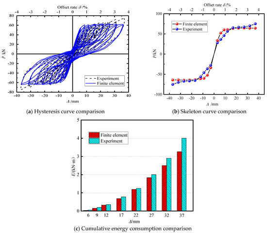 Figure 8c shows the cumulative energy consumption comparison between the test and the finite element. It can be seen from the figure that the results obtained from the initial loading test and the finite element tended to be consistent. When the loading displacement reached 37 mm, there was a slight gap between the two curves, but the error was guaranteed to be about 20%, which is related to the difficulty in controlling the hysteresis curve in the finite element simulation.