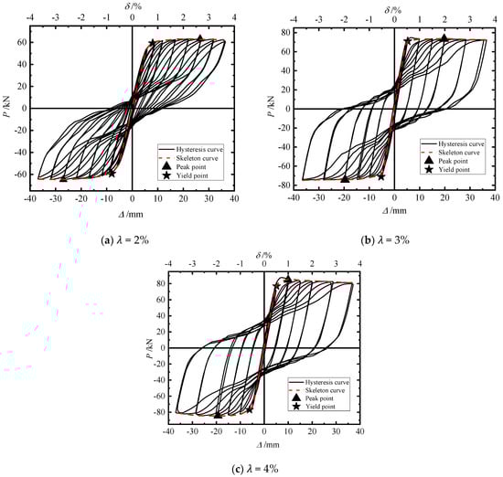 Figure 9 shows the hysteretic skeleton curve, and Figure 8a–c correspond to = 2%, 3%, and 4%, respectively. The characteristic points of the skeleton curve of the test piece are shown in Table 5, where : yield load; : yield displacement; : peak load; : peak displacement; : maximum displacement offset rate; and : displacement ductility coefficient.