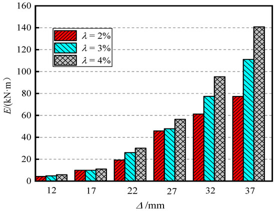 Figure 10 shows the influence of the section ratio on the energy dissipation capacity of piers. Through the comparison chart, it can be found that when the displacement loading amplitude is small, the cumulative total energy consumption of the three models is basically the same. When the displacement amplitude exceeds 27 mm (the offset rate is 2.7%), with the increase in the section ratio, the cumulative total energy consumption gradually increases, and the increase also gradually increases. When the displacement amplitude reached 37 mm (3.7% offset), for λ = 2%, 3%, and 4%, the final cumulative energy consumption of the pier was 79.64 kN·m, 112.36 kN·m, and 141.67 kN·m, respectively, which shows that increasing the section ratio helps to improve the energy consumption capacity of the pier.