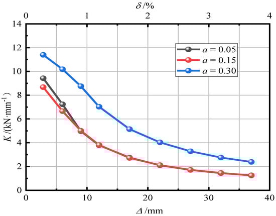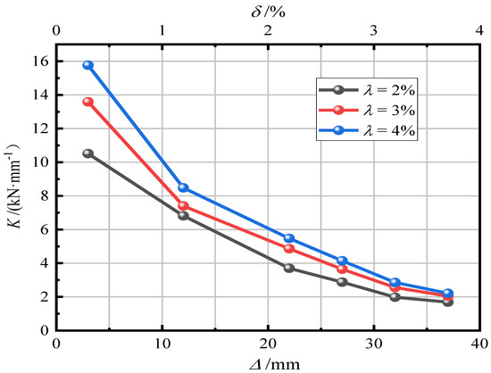 Figure 11 shows the effect of the section ratio on pier stiffness degradation. It can be seen that an increase in the section ratio can improve the initial stiffness of the pier, restrain the opening of the joint surface of the segment, effectively reduce the rotation deformation of the rigid body, and make the stress characteristics at the joint surface gradually close to the cast-in-place pier column so as to enhance the ability of the pier to resist deformation. With an increase in the section ratio, the degradation rate of stiffness gradually increases. When the displacement amplitude increases, the gap of the equivalent stiffness curve gradually decreases and finally tends to be consistent.
