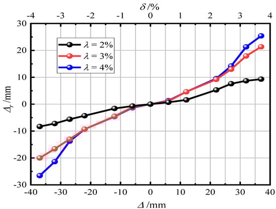 Figure 12 shows the influence of the section ratio on the residual displacement of the pier. It can be seen in Figure 11 that the when the section ratio was relatively small, the residual displacement was relatively small and the self-resetting ability was stronger. With an increase in the loss section ratio, the residual displacement increased continuously. After loading, for λ = 2%, 3%, and 4%, the residual displacement was 8.93 mm (0.89%), 22.52 mm (2.25%), and 27.35 mm (2.74%) respectively. This shows that an increase in the section ratio makes the self-resetting ability of the pier gradually worse. In the existing analysis, it is suggested that the section ratio should not exceed 2%.