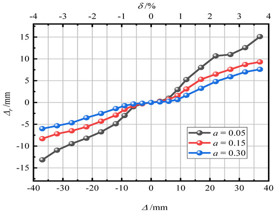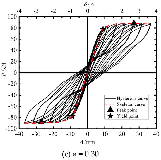 Figure 13 shows the hysteretic skeleton curves, and Figure 12a–c correspond to a = 0.05, 0.15, and 0.30, respectively. The characteristic points of the skeleton curve of the test piece are shown in Table 6, where : yield load; : yield displacement; : peak load; : peak displacement; : maximum displacement offset rate; and : displacement ductility coefficient.