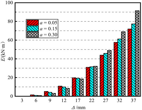 In order to study the influence of the axial compression ratio on the seismic performance of segmental CFST piers, the seismic performance of piers under cyclic loading, such as the hysteretic curve, cumulative energy consumption, residual displacement of the pier top, stiffness degradation, etc., were compared at a = 0.05, 0.15, and 0.30.