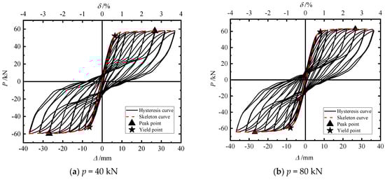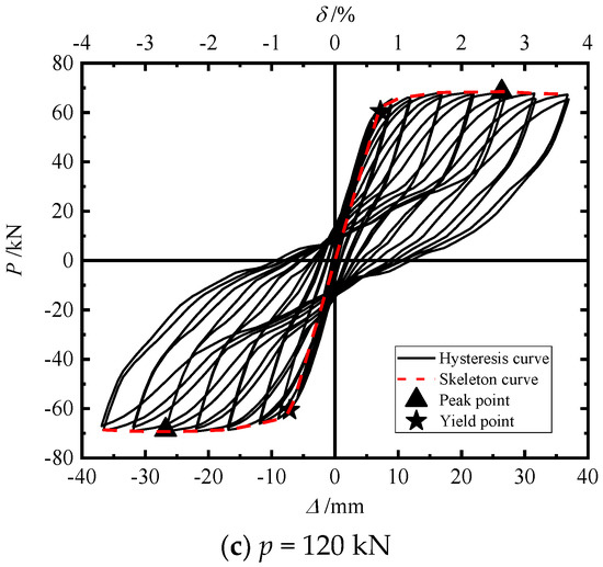 Figure 17a–c correspond to p = 40 kN, 80 kN, and 120 kN, respectively. The characteristic points of the skeleton curve of the test piece are summarized in Table 7, where : yield load; : yield load; : peak load; : peak displacement; : maximum displacement offset rate; and : displacement ductility coefficient.