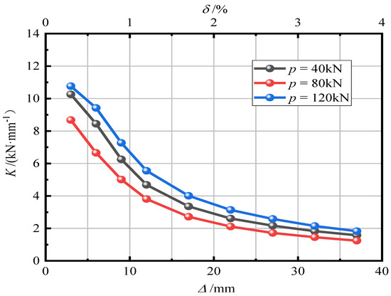 Figure 19 shows the effect of initial prestress on pier stiffness degradation. It can be seen in Figure 18 that when the initial prestress is large, the initial stiffness of the segmental assembled CFST pier is high, which indicates that increasing the initial prestress can enhance the lateral bearing capacity and deformation resistance of the pier. The change in initial prestress has little effect on the degradation rate of pier stiffness, but it can be seen in Figure 18 that when p = 120 kN the degradation rate of pier stiffness is faster, and the three curves are similar when the loading displacement reaches 37 mm (offset rate 3.7%).