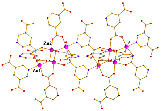 Crystallographic study revealed that the compound crystallized in space group C2/c and its asymmetric unit contained two Zn centers, one and a half 3, 5-Pyridinedicarboxylate groups, one hydroxide(OH−) anion and one coordinated water molecule (Figure S1). There were two kinds of Zn coordination modes, Zn1 was hexacoordinated by one hydroxide anion, three oxygen atoms from three PBA2− ligands, and one nitrogen atom from one PBA2− ligand, one water molecule, Zn2 adopted a pentagonal geometry, coordinated by three oxygen atoms from three different PBA2− molecules (Figure 1), the Zn-O distances were from 1.928(13) to 2.151(4) Å, the Zn-N bond length was 2.170(3) Å (Table S1). The PBA2− ligands showed two different coordination modes (La and Lb) (Figure S2). Each carboxylate group adopted µ2-η1:η1 bidentate mode, the hydroxide anion showed a µ2- bridging mode to coordinate to one Zn(1) and one Zn(2) center. To describe the extended framework of the compound, it was noted that two Zn(1) and Zn(2) centers are held together by two µ2-OH and six carboxylate groups from six PBA2− ligands to form a tetranuclear zinc cluster, {Zn4(OH)2(CO2)6}, which was further connected by eight PBA2− ligands to construct a 3D framework (Figure 2). From the topological viewpoint, La could be considered as a 3-connected node, while Lb could be defined as a linker and the [Zn4(COO)8] cluster could be viewed as an 8-connected node. Thus, the overall structure of this compound was a 3D (2,3,8)-connected framework with (43)2(46.66.815.12)(8) topology (Figure 3). Topological classification with the TOPOS TTD collection revealed that such a net has never been found in coordination polymers. The solvent accessible volume of the compound was estimated to be 48.7% of the total unit cell volume by using PLATON software.