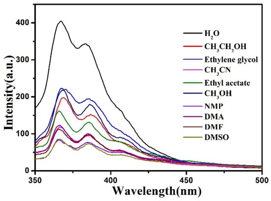 The fluorescent response of the compound towards various solvents was investigated to verify their luminescent character, DMF, DMA, DMSO, NMP (N-Methyl-2-pyrrolidone), ethanol, acetonitrile, methanol, ethyl acetate, ethylene glycol and H2O were selected in this work. Basically, 3 mg of the compound was well dispersed in 3 mL solvent and ultrasonicated for 30 min (3 mg/3 mL), leading to stable suspensions. As shown in Figure 4, the fluorescence intensities of the compound were highly depended on the solvents (λex = 320 nm); notably, in H2O, the compound demonstrated the strongest fluorescence emission, thus, H2O was chosen as the dispersed solvent to find the potential fluorescence information.
