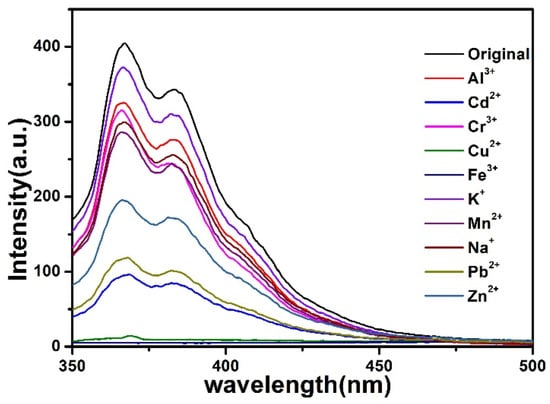To explore whether the compound could detect metal ions, 3 mg samples of the compound were sonicated in 3 mL M(NO3)x water solution (0.01 M) (M = Al3+, Cd2+, Cr3+, Cu2+, Fe3+, K+, Mn2+, Na+, Pb2+, Zn2+) for 30 min to give uniform suspensions (3 mg/3 mL). The luminescence intensities of the suspensions were measured, as illustrated in Figure 5, the luminescence intensities were heavily dependent on the metal ions (λex = 320 nm). Among them, Fe3+ and Cu2+ showed the most significant quenching effect. To explore the water stability of the compound, the as-synthesized sample was immersed in distilled water for 24 h. As illustrated in Figure S4, the PXRD pattern of this compound still remained stable. Meanwhile, the PXRD of the compound was measured after sensing the metal ions which retained their structural integrity (Figure S5).