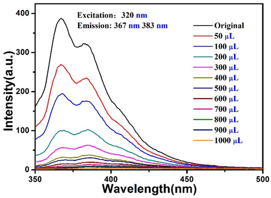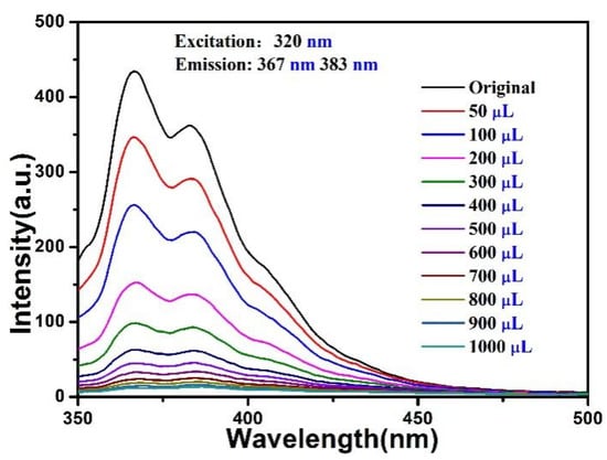 To further investigate the sensitivity of the compound for the detection of trinitrophenol, the fluorescence-quenching titration study was performed by the gradual addition of trinitrophenol aqueous solution (5 × 10−4 M) to the suspensions of the compound; the results showed that the luminescent intensity drastically decreased (Figure 9). According to the titration data, the Stern-Volmer plots were observed using the I0/I = 1 + Ksv [M] equation, a nearly linear correlation between the quenching rate and the concentration of trinitrophenol could be obtained, meanwhile Ksv for trinitrophenol was calculated 1.97 × 105 M−1 (R2 = 0.9848) (Figure S10), which is higher than other reported MOF sensors [35,36,37], and the limit detection of trinitrophenol is 0.35 mM.