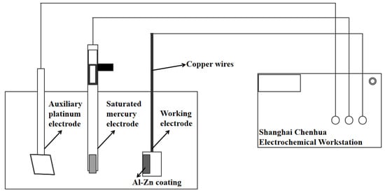 The surface and cross-section of the coating were observed with a 3D laser scanning confocal microscope (VK-X1000; KEYENCE, Osaka, Japan), and the surface roughness Ra and thickness of the coating were measured. ImageJ was used to characterize the porosity of the coating cross-section. The hardness of the coating was measured by a MHV-1000Z Vickers microhardness tester with a load of 50 g and a holding time of 10 s. Five points on the cross-section of the coating were selected for the hardness test, and the average value was taken as the coating hardness. In order to test the corrosion resistance of the coating sample, the electrochemical performance of the coating sample was tested. All electrochemical experiments were performed based on the CHI660E electrochemical workstation (Shanghai Chenhua Instrument Co., Ltd., Shanghai, China). A cold-sprayed Al–Zn coating sample was used as the working electrode, with an area of 5 mm × 5 mm. The reference electrode was saturated calomel electrode (SCE) and the auxiliary electrode was a 10 mm × 10 mm platinum sheet. The working solution used for the test was 3.5 wt.% NaCl solution. Impedance spectroscopy (EIS) was performed in the electrochemical experiment, and the frequency range was 10 mHz~100 KHz. A diagram of the test system is shown in Figure 3. The OCP test was performed before all EIS experiments, and the EIS test was performed according to the open-circuit potential obtained from the OCP test.