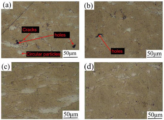The cross-section microscopic morphology of the coating at different spraying temperatures is shown in Figure 4. The coating mainly included gray-yellow and white areas, and the gray-yellow area was obviously more than the white area. Based on the deformation ability of the particles and the composition ratio of the coating material, the gray-yellow area was the Al element and the white area was the Zn element. According to Figure 4a, when the spraying temperature was 400 °C, there were nearly spherical Zn particles in the coating, and the particle deformation degree was small. When the spraying temperature was 500 °C, the particle deformation was sufficient and the bonding was tight with few defects, as shown in Figure 4c. As seen in Figure 4d, when the spraying temperature was 550 °C, the number of defects increased compared with those at 500 °C, and the particle deformation degree weakened. The reason for this phenomenon may be that at this temperature, the particle velocity exceeded the critical velocity and eroded the coating []. ImageJ was used to calculate the porosity of the coating section. The porosity of the coating was the highest at 400 °C, which was 1.41%. The porosity of the coating at 450 °C, 500 °C and 550 °C was 0.88%, 0.71% and 0.75%, respectively, which was consistent with the microscopic observation results.