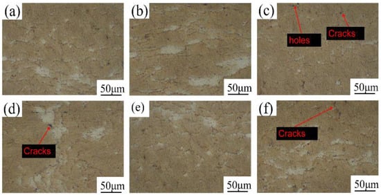 Microstructure of coating sections at different spraying distances: (a) 18 mm, (b) 20 mm, (c) 22 mm, (d) 25 mm, (e) 27 mm, (f) 30 mm.