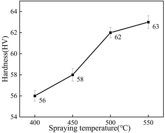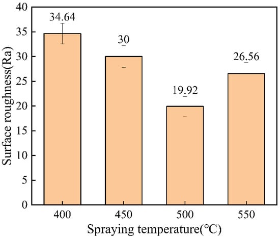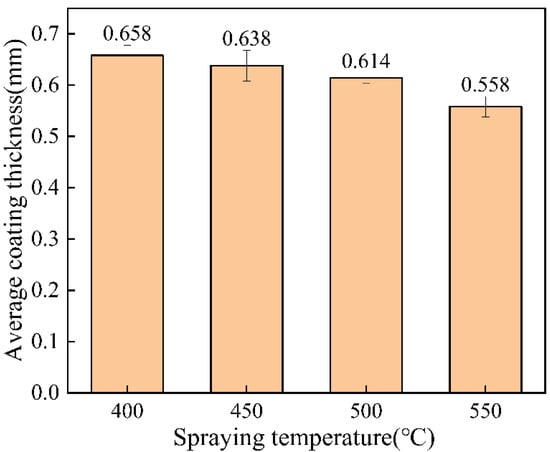 Surface roughness could reflect the deformation of cold-spraying particles to a certain extent []. The surface roughness of the coating is shown in Figure 7. When the spraying temperature was 500 °C, the surface undulation of the coating was the smallest, and when the spraying temperature was 400 °C, the surface of the coating was relatively rough. The average coating thickness at different spraying temperatures is shown in Figure 8. According to Figure 8, the coating thickness decreased with the increase in temperature, and the coating thickness changed little between 400 °C and 500 °C. When the spraying temperature was 550 °C, the coating thickness was small. This phenomenon occurred mainly because the particle velocity increased with the increase in temperature. Erosion occurred when the particle velocity exceeded the critical velocity, resulting in a relatively thin coating thickness [,,].