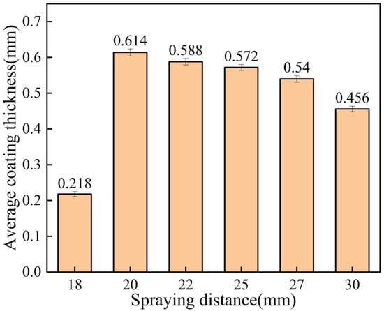 The surface roughness of the coating at different spraying distances is shown in Figure 9. As can be seen from Figure 9, the coating surface formed when the spraying distance was 18 mm was the most delicate, while the coating surface was relatively rough when the spraying distance was 30 mm. The average coating thickness at different spraying distances is shown in Figure 10. It can be seen that the coating thickness was the thinnest when the spraying distance was 18 mm, which means that under certain process parameters, when the coating is deposited to a certain thickness, it becomes more difficult for the subsequent particles to be deposited. That is, the deposition rate and erosion rate of the coating reached the equilibrium stage []. However, subsequent particles will continue to forge the deposited coating, producing an effect of polishing the coating surface, so the resulting coating is thin with low roughness. When the spraying distance was 20 mm, the maximum thickness was 0.614 mm, and at 30 mm, the thickness was 0.456 mm. When the spraying distance was 20–30 mm, the acceleration effect of the carrier gas on the particles and the comprehensive effect of the resistance wave on the surface of the substrate gradually decreased the kinetic energy of the particles, so the thickness decreased gradually.